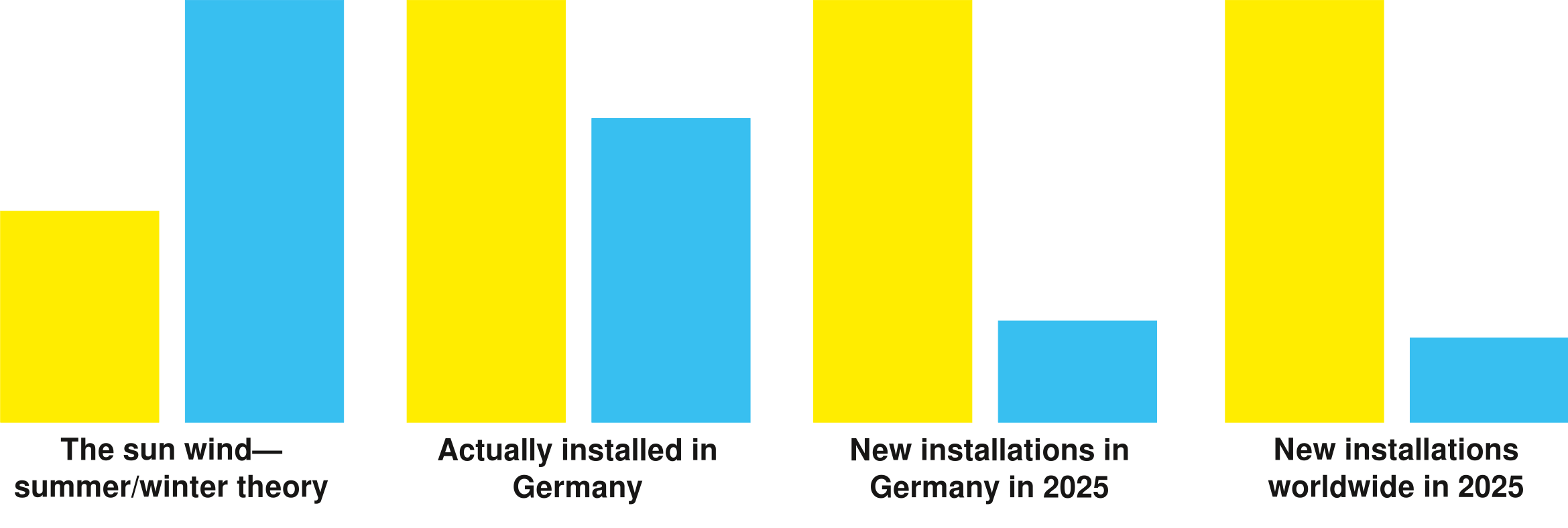 冬至の正午の太陽の高さは、オルボーでは9.76度であるのに対し、18.76度である。これは24×365の歩留まりを37.5%増加させるのに十分である。